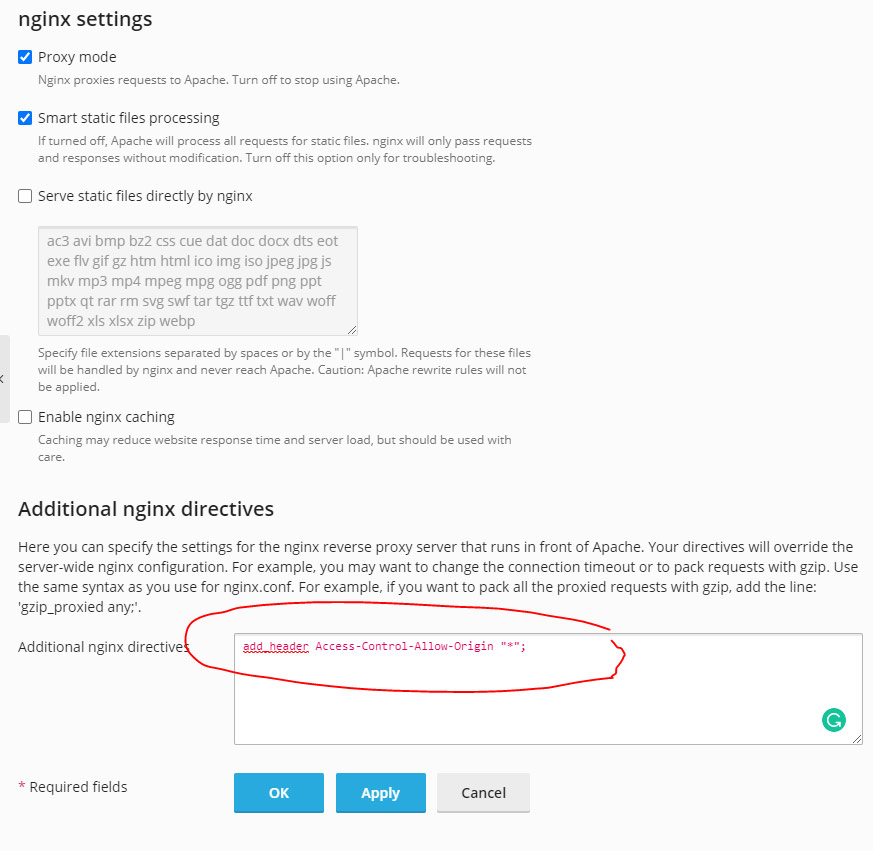 For nginx servers — Edit the file /etc/nginx/nginx.conf of the domain where the plugin is installed and enter the code http { add_header Access-Control-Allow-Origin "*"; } at the top of the file. If you're using Plesk go to
